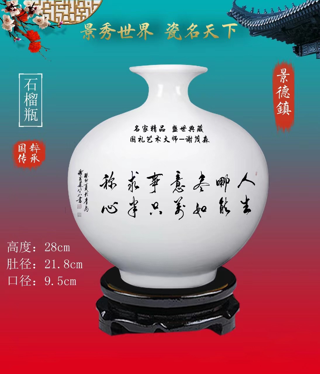 高度28cm肚径21.8cm口径9.5cm景德镇石榴瓶